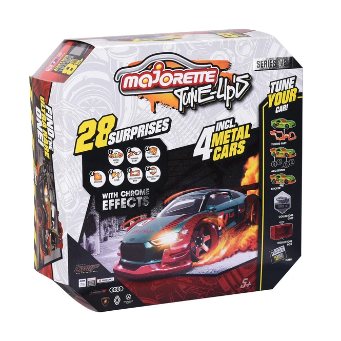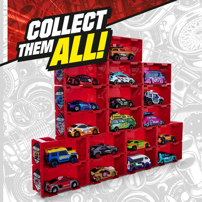 Für spielfreudige Autoquartett-Begeisterte gibt es außerdem zu jedem Spielauto einen Sammelchip, der gespielt und getauscht werden kann. Jeder Sammelchip enthält die Attribute: Terrain, Speed und Style. Mithilfe des beiliegenden Stickerbogens und den exklusiven Anbauteilen werden die Autos mit ein wenig Geschick schnell zu einzigartigen Unikaten. Fertig getuned versprechen die Tune Ups rasante Abenteuer! In der stapelbaren Aufbewahrungsbox präsentiert sich jedes Modell von seiner besten Seite!