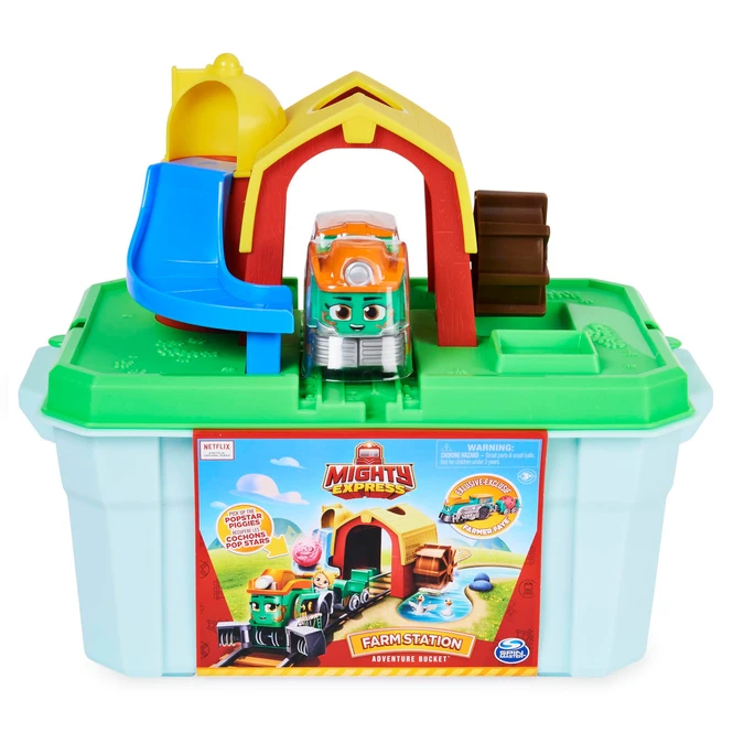 Mit dem Mighty Express Farmbahnhof Spielset werden die Abenteuer auf Land rund um Lokstadt zu Hause lebendig. Der Deckel des praktischen Aufbewahrungsbehälters wird mit Scheune und Silo mit Rutsche zum Teil des Spielsets, das mit 11 Schienenstücken ausgebaut wird. Farm-Frieda, die Lok mit Güterwaggon, rollt darauf ins Abenteuer. Wie in der beliebten TV-Serie ist die Scheune mit einem Wasserrad ausgestattet und ein Schweinchen Cool Ball, der fantasievolle Spielideen inspiriert, ist ebenfalls enthalten. Einfach den Schweinchen-Ball die Rutsche hinunterrollen lassen und schon landet er in Friedas Güterwaggon mit speziellem Schlamm-Design. Die Lok anschieben und schon rollt der Zug mit seiner kostbaren Fracht los und die Schweinchen beginnen zu Tanzen.